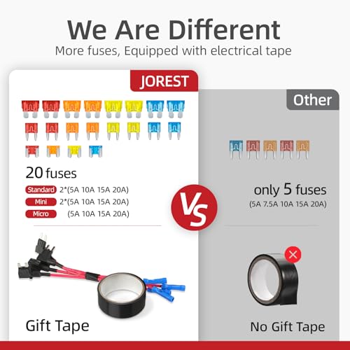 Specificaties: JOREST 6 stuks autozekeringhouders adapter set, 3 soorten standaard mini-micro-add A circuit zekeringen, 12-32 V auto piggyback, 20 stuks (5 A, 10 A, 15 A, 20 A), lemmet zekeringen + kleefband