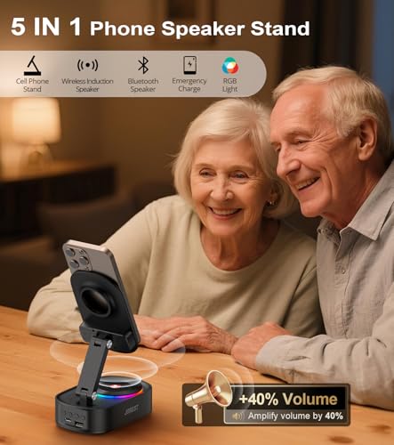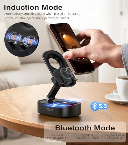 Jorest Draadloze bluetooth-luidspreker, inductie-luidspreker met telefoonhouder, compatibel met iPhone/Android/iPad voor thuis, kantoor, douche, outdoor, reizen, cadeau voor mannen, vader, maar