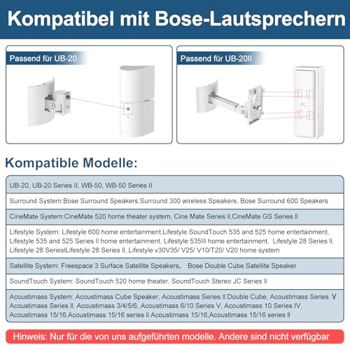 Compatibiliteit: plafondhouder en wandhouder voor Bose UB-20, UB-20 serie II, WB-50 serie II, UFS-20 serie II, UTS-20 serie II, voor Bose surround luidsprekers, Lifestyle 600 Home Entertainment-systeem – voor CineMate 520, CM520, Cine Mate serie II, GS serie II, Virtually Invisible 3000. – Voor Lifestyle Sound: Touch 300 535 525 520 600 535III 525III ST535 ST525 ST520 Home System, Stereo JC Serie II WiFi-muzieksysteem