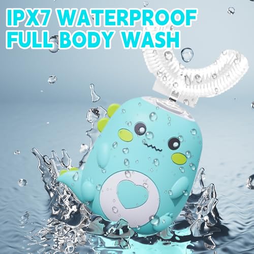 Schattig design: deze elektrische U-vormige tandenborstel voor kinderen, versierd met een schattige dinosaurus, maakt poetsen leuk. De ergonomische U-vormige borstelkop bestaat uit voedselveilige siliconen borstelharen, die de tanden zacht omhullen voor een 360° reiniging.
