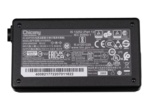 Spanning: 19 Volt, Stroomsterkte: 3,42 Ampère, Uitgang: 65 Watt, Ingang: one hundred-240V / 50-60Hz, Energie-efficiëntie: VI
