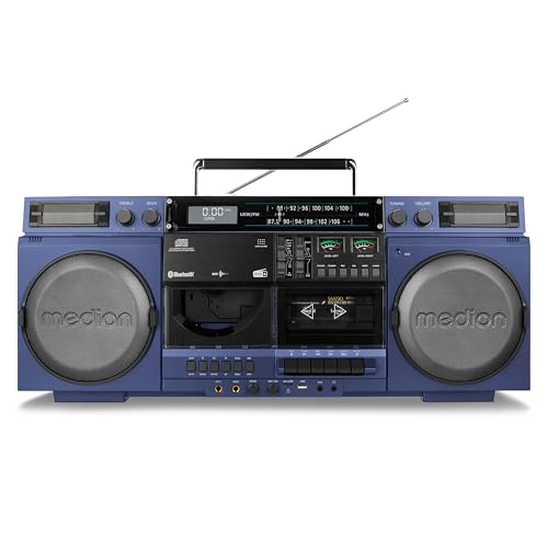 MEDION P66538 Cassetterecorder (retro boombox met cd-speler, jaren 80, groot, USB, SD, cd, cassette MC, DAB+ radio telescopische antenne, Bluetooth, cassettedeck, opnamefunctie, werkt op batterijen)