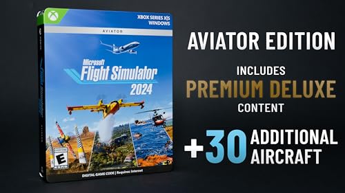 Aviator Edition – de ultieme versie van Microsoft Flight Simulator 2024: Bevat de volledige Premium Deluxe Edition plus extra exclusieve content en features. Inclusief de complete Microsoft Flight Simulator 2024 (MSFS 2024) met 30 zeer gedetailleerde vliegtuigen, realistische vliegfysica, wereldwijde scenery, dynamisch weer en alle updates – de meest uitgebreide en realistische simulatie-ervaring voor veeleisende piloten.