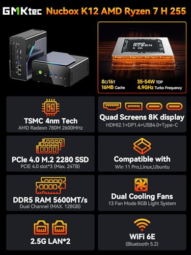 Barebone Mini PC – versatile DIY Support – The K12 Barebone Mini PC is good for customers with excessive customization wants. It helps DDR5-5600 MHz SO-DIMM (RAM not included) and PCIe 4.0 SSD storage (SSD not included). Geared up with three M.2-2280 growth slots, every slot helps as much as 8 TB, with a most complete capability of 24 TB. Excellent for customers who need to construct and increase efficiency flexibly in response to their very own necessities.
