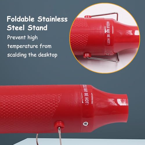 Duurzame materialen: dit heteluchtpistool is gemaakt van hoogwaardige kunststof materialen, is fijn afgewerkt, slijtvast en duurzaam, praktisch en efficiënt. Wordt geleverd met een opvouwbare standaard van roestvrij staal, die zelfstandig kan staan en als tafelapparaat kan worden gebruikt. Voorkomt dat het mondstuk het bureau of andere voorwerpen bij hoge temperaturen verbrandt.