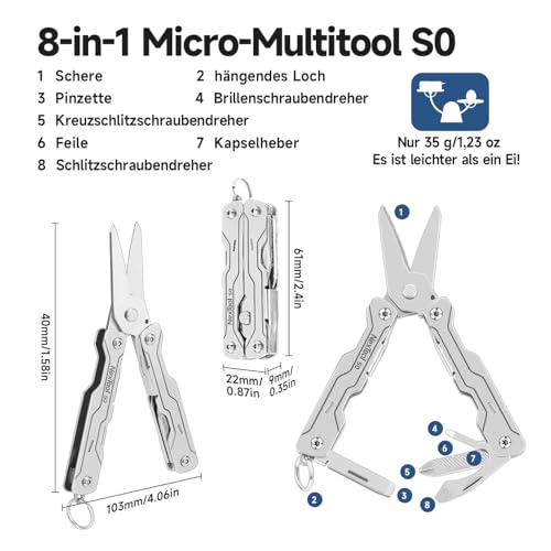 Specificaties: NexTool Multitool Mini Sailor Schaar S0,8-in-1 Micro Ultralicht EDC Multitool voor sleutelhanger met tandschaarsnijder, pincet, camping en wandelen voor DIY, outdoor en dagelijks gebruik, cadeau voor