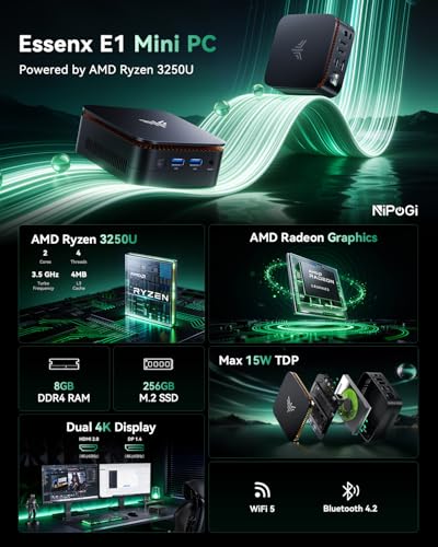 NiPoGi Essenx E1 Mini PC ΑΜD Ryzen 3250U W-11 Pro (2C/4T, tot 3,5 GHz) 8GB DDR4 RAM + 256GB SSD, 4K@60Hz Dual Display HDMI 2.0 + DP 1.4 / Wi-Fi 5 / BT 4.2 / LAN, Mini Desktop PC voor Kantoor/Onderwijs