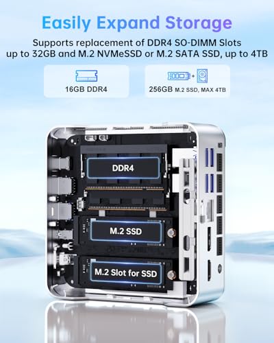 【16 GB DDR4 + 256 GB M.2 SSD, Flexibele Uitbreiding】De P2 mini-pc wordt geleverd met 16 GB DDR4 RAM en een 256 GB M.2 SSD. De geïntegreerde 256 GB M.2 SSD maakt het mogelijk om snel meerdere belangrijke bestanden op te slaan en verkort de opstarttijd. De mini-pc kan worden uitgebreid met een M.2 NVMe PCIe 3.0 SSD of een M.2 SATA SSD tot maximaal 2 TB. Ideaal voor kantoorwerk en dagelijks gebruik, ontworpen voor efficiënte gebruikers die meerdere functies in één machine willen uitvoeren.