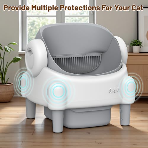 Specificaties: Open Top Zelfreinigende Kattenbak, Automatische Kattenbak voor Meerdere Katten met APP Controle, Veiligheidssensor & 2-Roll Kattenvoeringen, Wit & Grijs