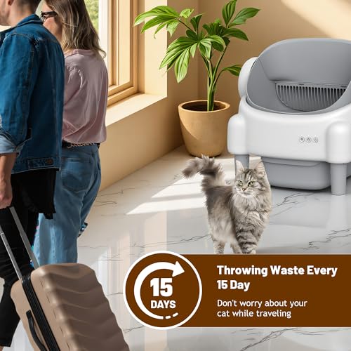 Open Top Zelfreinigende Kattenbak, Automatische Kattenbak voor Meerdere Katten met APP Controle, Veiligheidssensor & 2-Roll Kattenvoeringen, Wit & Grijs