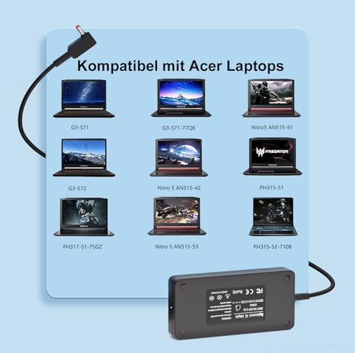 Specificaties: Oplader van 180 W, compatibel met Acer Nitro 5 7 AN515-44 AN515-51 AN515-55 AN517-51 AN715-52 V15 V17 Predator Helios 300 500 Gaming Laptop G3-571 G3-572 PH311 5 tot 52 jaar. PH317-51 voeding