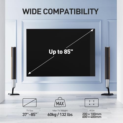 STERKE EN DUURZAME TV-WANDBEUGEL – Ervaar de kracht van onze tv-wandbeugel. Deze tv-beugel is ontworpen voor de meeste tv’s van 37 tot 85 inch (94-216 cm) met een gewicht tot 60 kg en zorgt ervoor dat uw televisie stevig op zijn plaats blijft. Hij is compatibel met VESA-patronen 600×400, 600×200, 500×300, 400×400, 400×300, 400×200, 300×400, 300×300, 300×200, 200×400, 200×300, 200×200 en 200×100 mm. Vergeet niet om het VESA-patroon en het gewicht van uw tv te controleren voordat u deze tv-muurbeugel aanschaft
