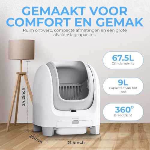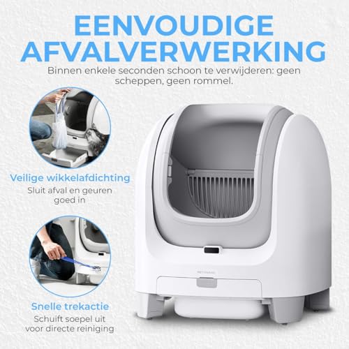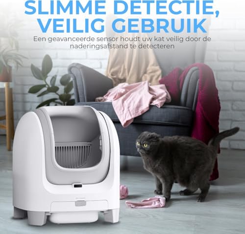 SLIMME TECHNOLOGIE: Wifi-verbonden systeem met smartphone app voor het volgen van kattenbezoeken, gewicht en reinigingscycli, plus proximity-sensor voor veiligheid.