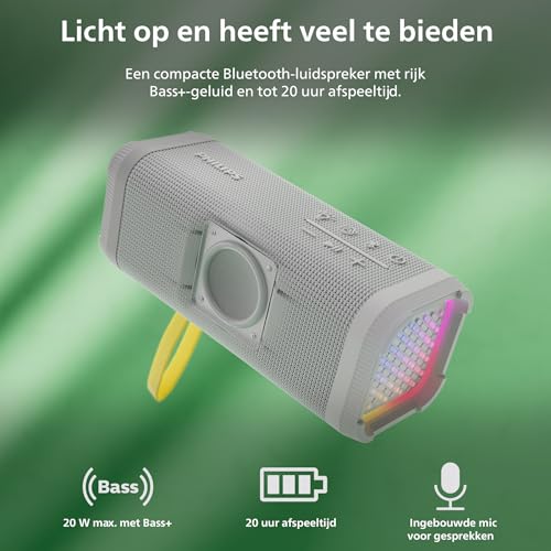 Specificaties: Philips TAS2000W Bluetooth Wireless Speaker met led-lichtshow, 20 W Bass+, Auracast, 20 uur afspeeltijd, IPX5 waterwerend, USB afspelen, mic, app-bediening – Wit