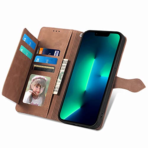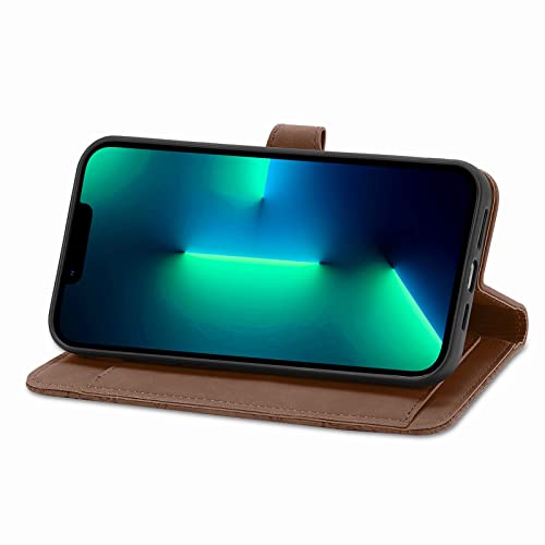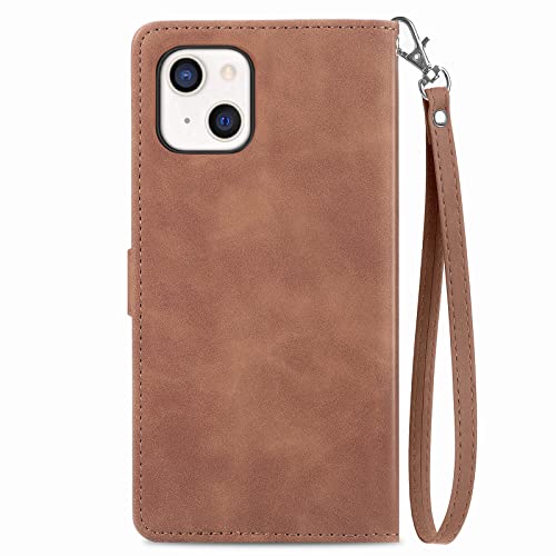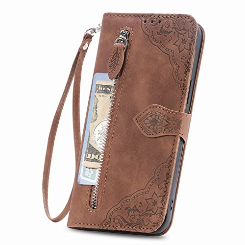 Portemonnee Hoesje met rits voor Apple iPhone 13 Mini, Portemonnee met creditcardhouder, Strap Stand, Vrouwen Lederen Flip Case, Bloemen Opvouwbare Cover, Schokbestendig – Bruin