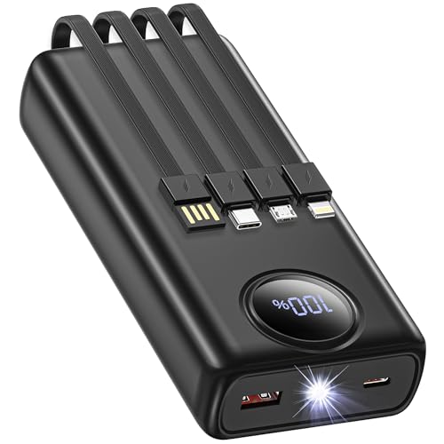 Power Bank 20000mAh met 4 Ingebouwde Kabels, 22,5 W Powerbank Snellaadfunctie en LED Display voor Op reis en kamperen Draagbare Oplader USB C Powerbank met Zaklamp voor iPhone 17 16 15 14/iPad/Samsung