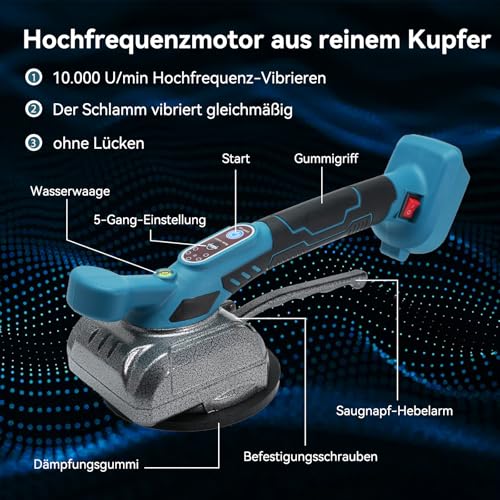 Plaats de eerste recensie voor “Professionele tegelschudder voor Makita 18V-systeem, 100 kg hechtkracht, 13 cm zuiger, 5-traps snelheid, ideaal voor keramiek, natuursteen en glas (30-260 cm), accu niet inbegrepen”