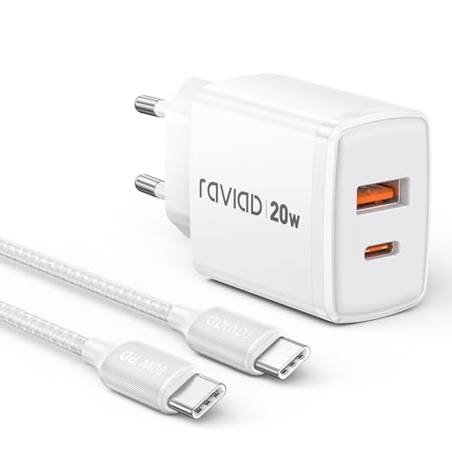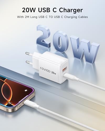 Specificaties: RAVIAD 20 W USB C oplader, 2 poorten type C oplader (USBA + USBC) met 2 M USB C-kabel, snellader compatibel met iPhone 16 15 14 13 Pro Max, Galaxy S25 S24 S23, iPad, Macbook