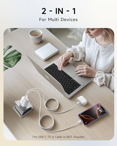 2-in-1 oplaadontwerp met dubbele voeding: de 20 W iPhone-oplader heeft een USB-C-aansluiting en een USB-A-aansluiting, je kunt probleemloos twee apparaten tegelijkertijd opladen, perfect voor zakenreizen, kantoorvakantie of thuis. Opmerking: als twee poorten tegelijkertijd worden opgeladen, schakelt de uitgang van de poort over naar de vrijgavemodus van A-aansluiting en C-aansluiting. Het laadvermogen van de twee poorten bedraagt 7,5 W en het totale vermogen bedraagt 15 W