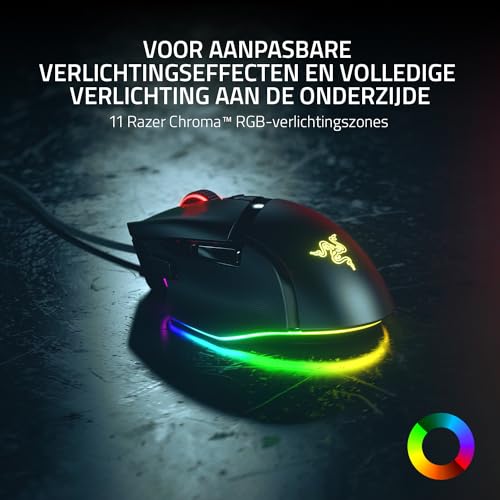 11 RAZER CHROMA RGB-VERLICHTINGSZONES: Baad in het licht van de Razer Basilisk V3 door elke zone aan te passen met ruim 16,8 miljoen kleuren en ontelbare verlichtingseffecten, en dat met dynamische reacties in meer dan 150 video games met ondersteuning voor Chroma.