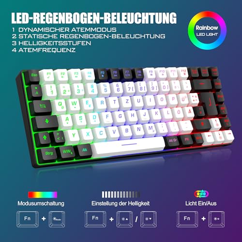 Toetsenbord en muis met achtergrondverlichting: het K84 75% gaming-toetsenbord beschikt over 4 led-achtergrondverlichtingsmodi, 4 helderheidsniveaus, 3 vaste verlichtingsmodi en 1 dynamische achtergrondverlichtingsmodus. Het verlichte ontwerp van de letters en spaties maakt het tot het beste verlichte draadloze mini-toetsenbord op de markt. De muis heeft een ingebouwd cyclisch progressief lichteffect met 7 kleuren.