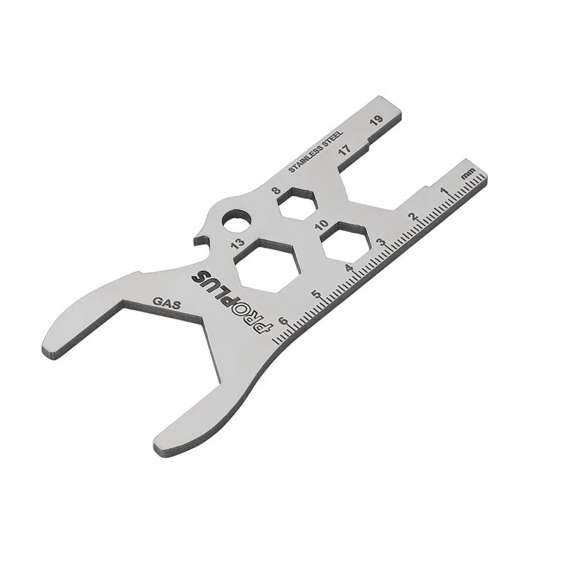 Veelzijdig inzetbaar: geoptimaliseerd voor flessen van 5 en 11 kg. Door de sleutelbreedtes 17, 19 en 30 mm en de uitsparingen van 8, 10 en 13 mm heb je voor bijna elke schroef de juiste oplossing. Robuust en weerbestendig: omdat het gereedschap uit hoogwaardig roestvrij staal bestaat, trotseert het regen en vocht bij gebruik buitenshuis – geen roest, geen buigen. Compact design: met het praktische ophangoog kan het gereedschap direct aan de sleutelhanger of in de gasbak worden bevestigd. Nooit meer lang zoeken in de gereedschapskoffer!