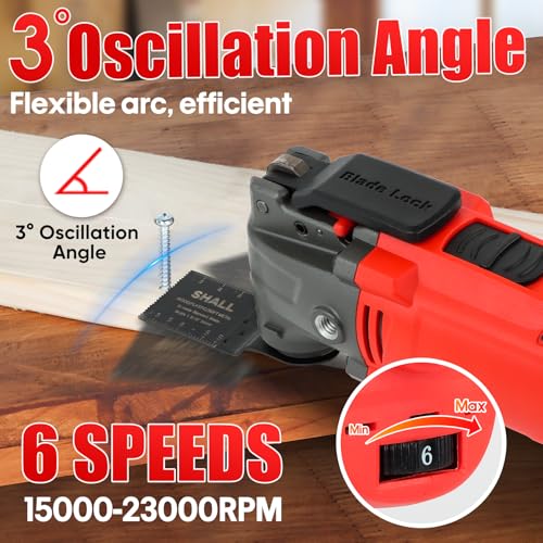 Specificaties: SHALL Oscillerend Multitool, 300 W Multifunctionele Gereedschapsset met 3° Oscillatiehoek, Snelwissel- en Terugslagsysteem, 6 Snelheidsstanden, Hulpgreep, 40-delig Zaagaccessoire