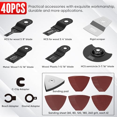 40-delige accessoireset: HCS voor hout (3/8 inch), HCS voor hout (3/4 inch), harde schraper, voor metaal/hout (1-5/16 inch), voor hout/kunststof (1-5/16 inch), HCS halve maan (3-7/16 inch), C-clip adapter, Bosch adapter, Dremel adapter, schuurbladen (korrel 60, 80, 120, 180, 240, elk 6 stuks).