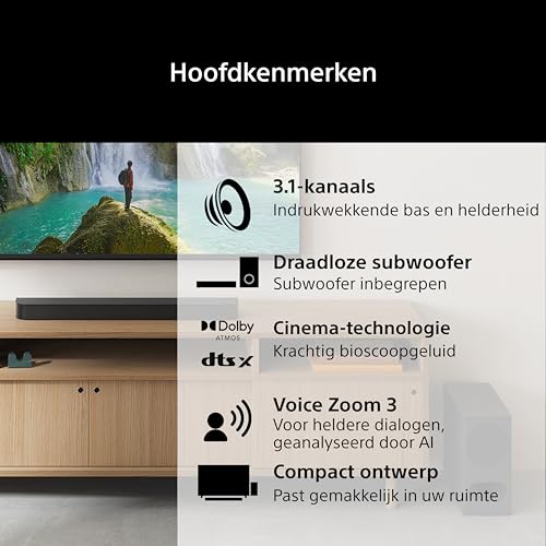 Specificaties: Sony BRAVIA Theatre Bar 5, 3.1-kanaals soundbar met krachtige draadloze subwoofer, surroundgeluid via Dolby Atmos®/DTS:X®, BRAVIA Connect-app voor Sony Smart TV, Bluetooth®, HT-B500, model 2026