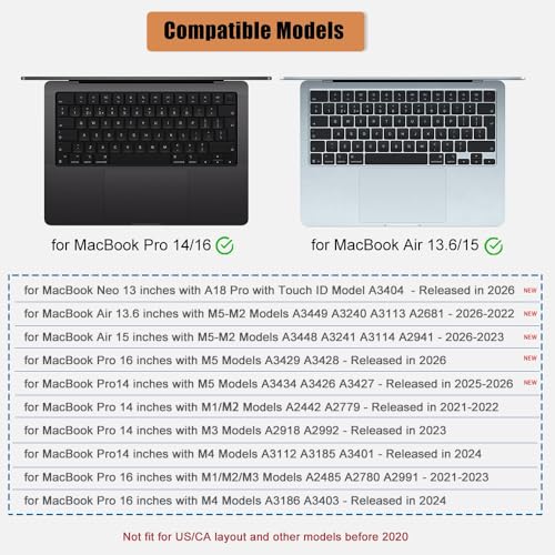 Toetsenbordhoes voor 2026-2021 MacBook Air/Pro/Neo 13/13,6/14/15/16 inch (A18/M5/M4/M3/M2/M1) A3404 A3448 A3449 A3434 A3426 A3428 Beschermer Accessoires