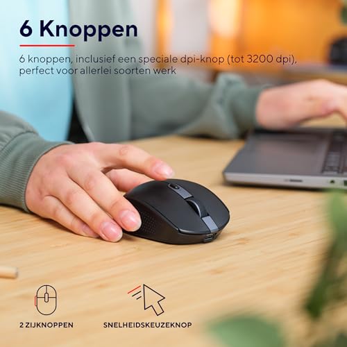 Compacte, draadloze muis met aansluiting voor meerdere apparaten en stille knoppen