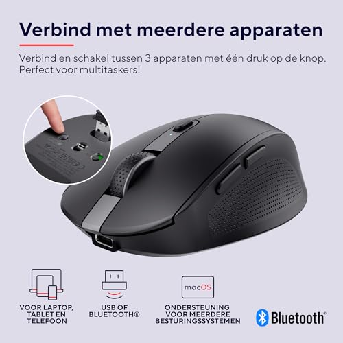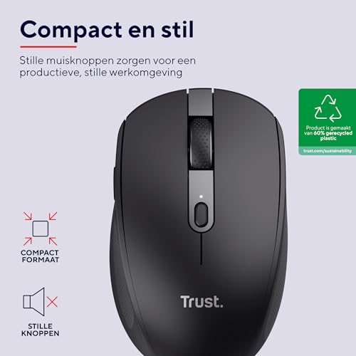 Specificaties: Trust Ozaa Stille Draadloze Muis Bluetooth + 2.4GHz, Compacte Wireless Mouse, 60% Gerecycled Plastic, Oplaadbare Bluetooth Mouse PC Computer Laptop Windows Android Mac – Zwart