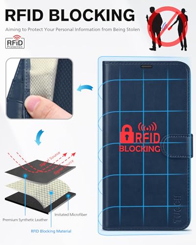 iPhone 13 Pro hoesje leren portemonnee met RFID bescherming biedt veilige opbergruimte voor kaarten en contant geld en beschermt je telefoon tegen schokken en krassen dankzij de schokbestendige TPU binnenkant. Inclusief standaardfunctie voor handsfree gebruik.
