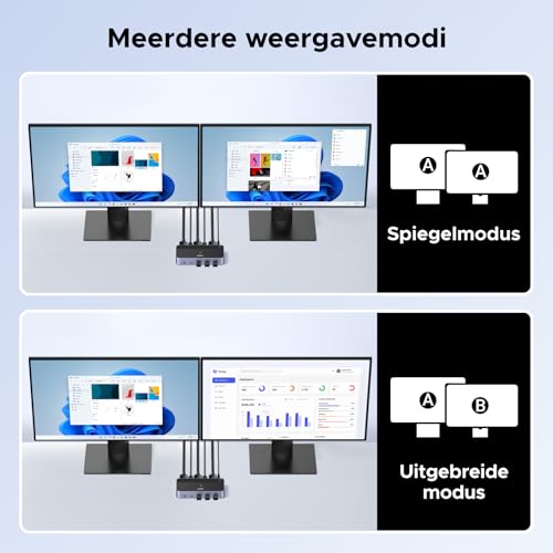 Twin-monitor KVM Switching: Ondersteunt twee computer systems (DP-ingang) om twee DP-monitoren te delen, eenvoudig schakelen. Wanneer je het gebruikt, kun je kiezen voor de kopieermodus of uitgebreide modus om je te helpen de efficiëntie van een kantoor met meerdere apparaten te verbeteren. Opmerking: De twee DP-uitgangspoorten A/B moeten overeenkomen met de DP-ingang A/B, geen kruisbeeld.