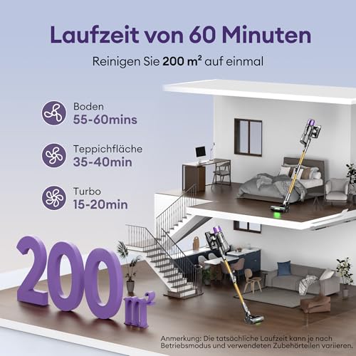 60 MIN VERMOGEN: De lithium-ionbatterij met 8 cellen biedt tot 60 minuten continu schoonmaakwerk tot 200 m². Dankzij 3 modi (Turbo / Tapijt / Harde vloer) en een display dat de resterende tijd aangeeft, past het vermogen zich op intelligente wijze aan de beschikbare energie aan, waardoor je totale controle hebt over je schoonmaaksessie