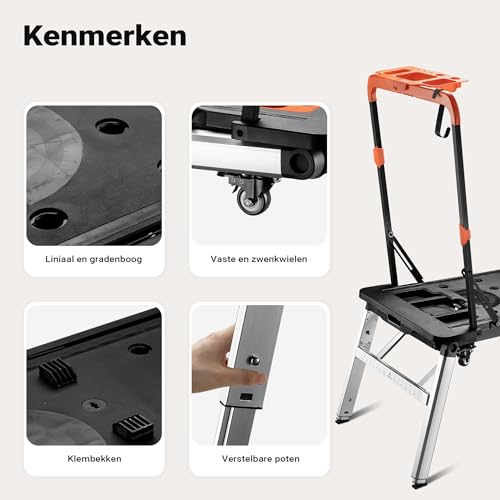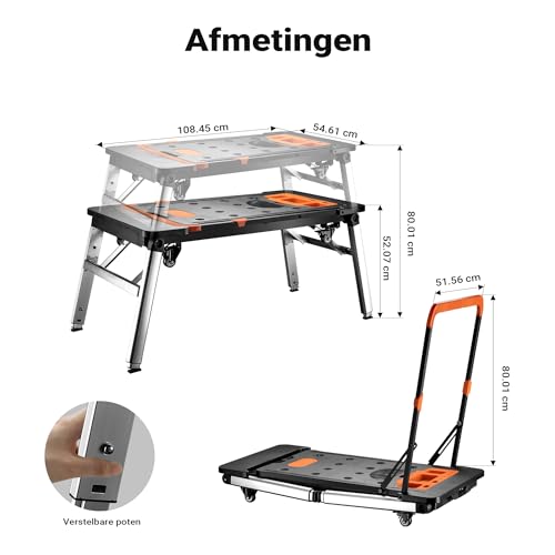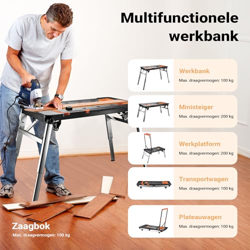 Specificaties: 7-in-1 multifunctionele werkbank Wiltec – inklapbaar zaagbok, werkplatform, rolplank, handkar, trolley, transportwagen, steiger