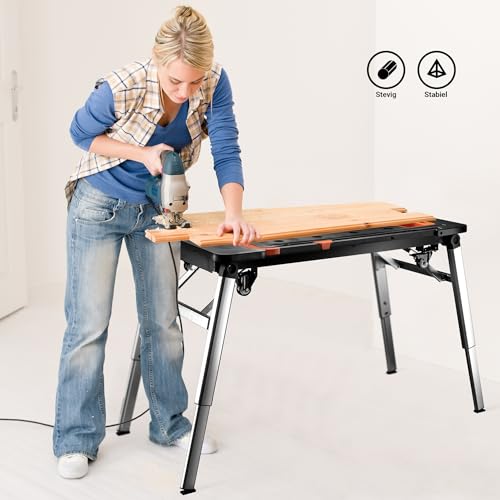 De 7-in-1 multifunctionele werkbank Wiltec biedt zeven functies in één inklapbaar en mobiel systeem. Zo wissel je snel tussen zaagbok, werkplatform, rolplank, handkar, trolley, transportwagen en steiger, wat werk eenvoudiger en sneller maakt. Deze werkbank bespaart ruimte en tijd doordat hij compact inklapbaar is en makkelijk verplaatst kan worden dankzij vier wielen, waaronder twee met rem. Je hebt altijd je gereedschap bij de hand dankzij handige haak en tas. Door het stevige materiaal gebruik je de werkbank veilig bij zware klussen. – Draagvermogen: tot 150 kg – Afmetingen uitgeklapt: 120 x 60 x 90 cm – Materiaal: staal, aluminium, PP, ABS, nylon, TPR – Wielen: 2 vaste, 2 zwenkwielen met rem – Gewicht: ca. 18 kg Deze werkbank is ideaal voor klussen in de werkplaats, tuin, bouw of bij transport. Perfect voor zagen, tillen, vervoeren en werken op hoogte. Dankzij het multifunctionele ontwerp gebruik je één tool voor verschillende taken.
