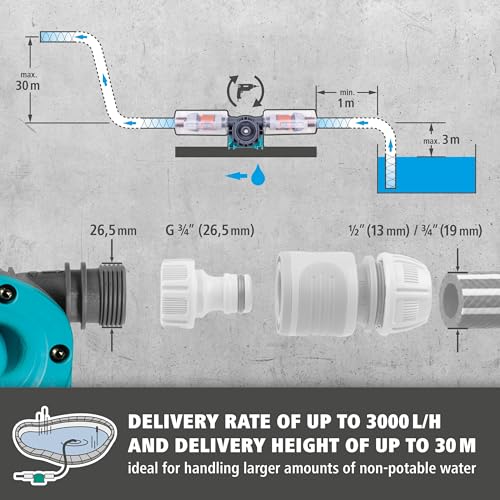 tot 3000 l/h pompcapaciteit en tot 30 m opvoerhoogte – superb voor gemiddelde hoeveelheden huishoudwater, bijvoorbeeld leegpompen van tuinvijvers