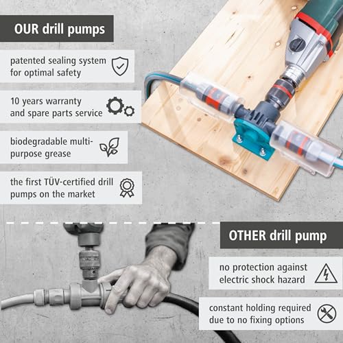 Gebruiksaanwijzing: Lees voor gebruik van de boormachinepomp de veiligheids- en gebruiksinstructies in de handleiding zorgvuldig door. De boormachinepomp is uitsluitend geschikt voor het tijdelijk pompen van huishoudwater tot maximaal 40 °C. Allow op dat de pomp niet geschikt is voor drinkwater en levensmiddelen of water voor aquariums, vijvers en enzovoort. Bovendien mag deze niet worden gebruikt voor giftige, bijtende, licht ontvlambare of explosieve stoffen en very wellniet voor vloeistoffen uit zonnecollectoren en warmtedragers of CV-vloeistof.