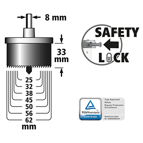 7 snelwisselinzetstukken (Ø 25, 32, 38, 45, 50, 56, 62 mm), met fijne vertanding, 33 mm snijdiepte