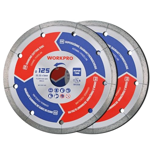 WORKPRO 2 x 125mm Profi Diamantdoorslijpschijven, 1,2mm Superdunne Diamantschijf voor Droog, Nat Snijden van Keramiek en Tegels, Compatibel met Winkelslijper