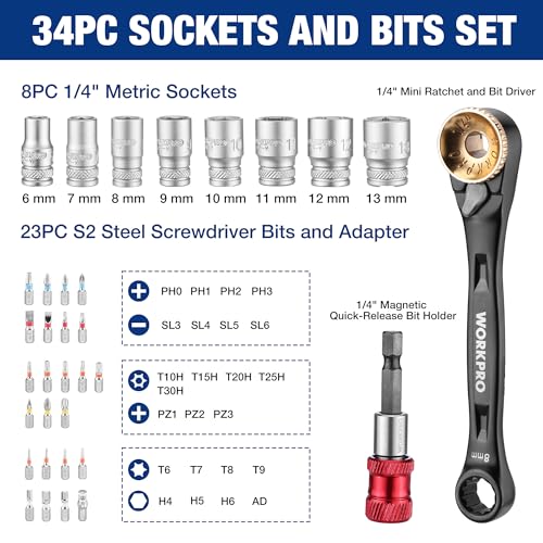 WORKPRO 34-delige dubbelzijdige 1/4″ mini-ratelsleutelset bevat 23-delige schroevendraaierbits en 8-delige doppen, 72-tands dopsleutel met omkeerbaar schakelaarontwerp, ideaal voor krappe ruimtes