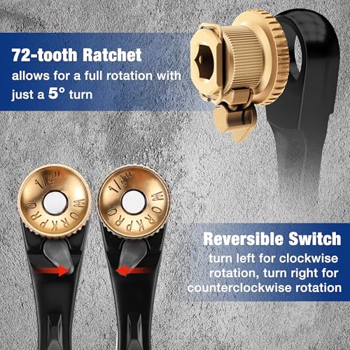 Specificaties: WORKPRO 34-delige dubbelzijdige 1/4″ mini-ratelsleutelset bevat 23-delige schroevendraaierbits en 8-delige doppen, 72-tands dopsleutel met omkeerbaar schakelaarontwerp, ideaal voor krappe ruimtes