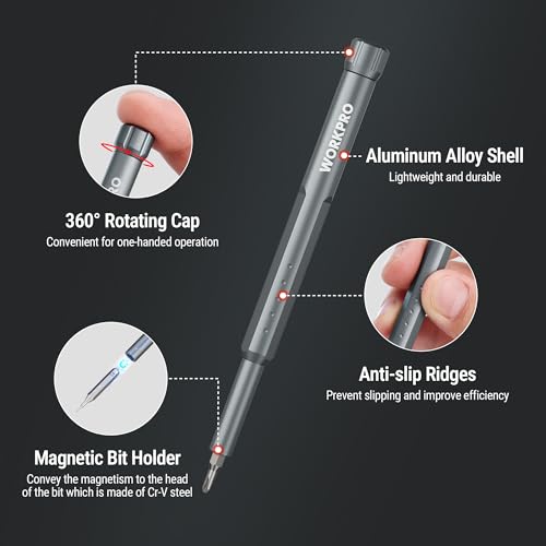 Hoogwaardige materialen: De handgreep en behuizing van de schroevendraaier zijn gemaakt van een stevige aluminiumlegering, handvat met een soepel draaiende eindkap voor eenvoudige bediening met één hand. Alle magnetische bits zijn gemaakt van hoogwaardig CR-V-staal met een grijs fosfaatcoating, wat uitstekende weerstand biedt tegen vervaging, slijtage en corrosie. Hoge hardheid zorgt voor langdurige prestaties en duurzaamheid voor al uw reparatiebehoeften
