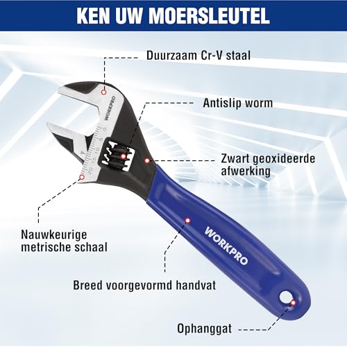 Specificaties: WORKPRO Brede Mond Verstelbare Moersleutel en Pijpsleutel, 150mm Metrische Verstelbare Sleutel met Bi-Materiaal Zachte Grip