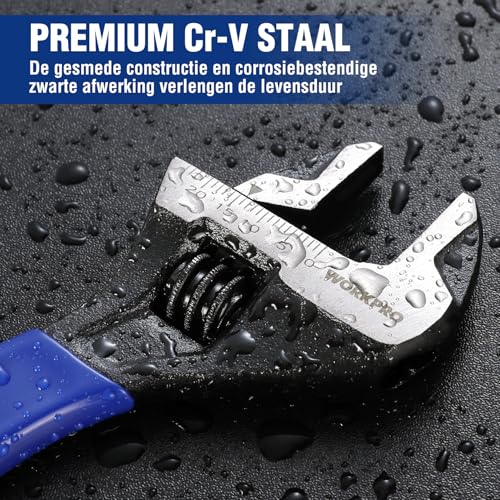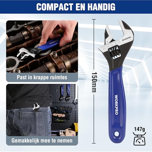 WORKPRO Brede Mond Verstelbare Moersleutel en Pijpsleutel, 150mm Metrische Verstelbare Sleutel met Bi-Materiaal Zachte Grip