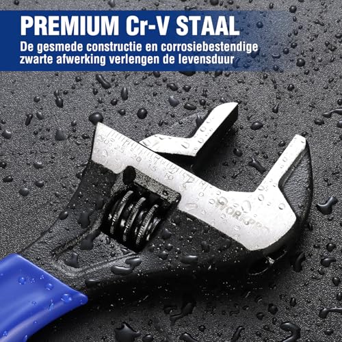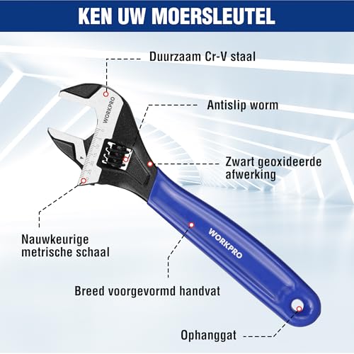 Specificaties: WORKPRO Brede Mond Verstelbare Moersleutel en Pijpsleutel, 200mm Metrische Verstelbare Sleutel met Bi-Materiaal Zachte Grip