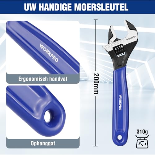 WORKPRO Brede Mond Verstelbare Moersleutel en Pijpsleutel, 200mm Metrische Verstelbare Sleutel met Bi-Materiaal Zachte Grip
