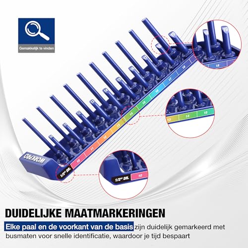 Snelle maatidentificatie: Elke pen is gemarkeerd met duidelijke maatinformatie om de dopsleutels snel en gemakkelijk te kunnen identificeren en tijd te besparen tijdens het werk. Het ontwerp met twee banen biedt tegelijkertijd plaats aan lange en korte doppen, voor een veelzijdige en efficiënte organisatie