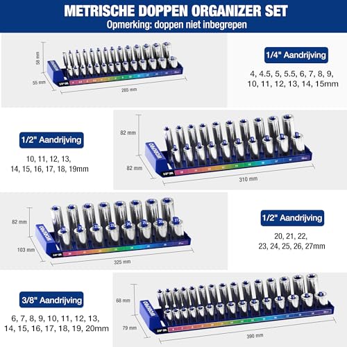 Grote opslagcapaciteit: Deze opbergset biedt plaats aan 94 metrische doppen en is een essentieel hulpmiddel voor elke doppenverzameling. De set bevat vier houders die compatibel zijn met 1/four“, three/eight” en 1/2” aandrijving zodat je doppen veilig op hun plaats blijven en gemakkelijk toegankelijk zijn